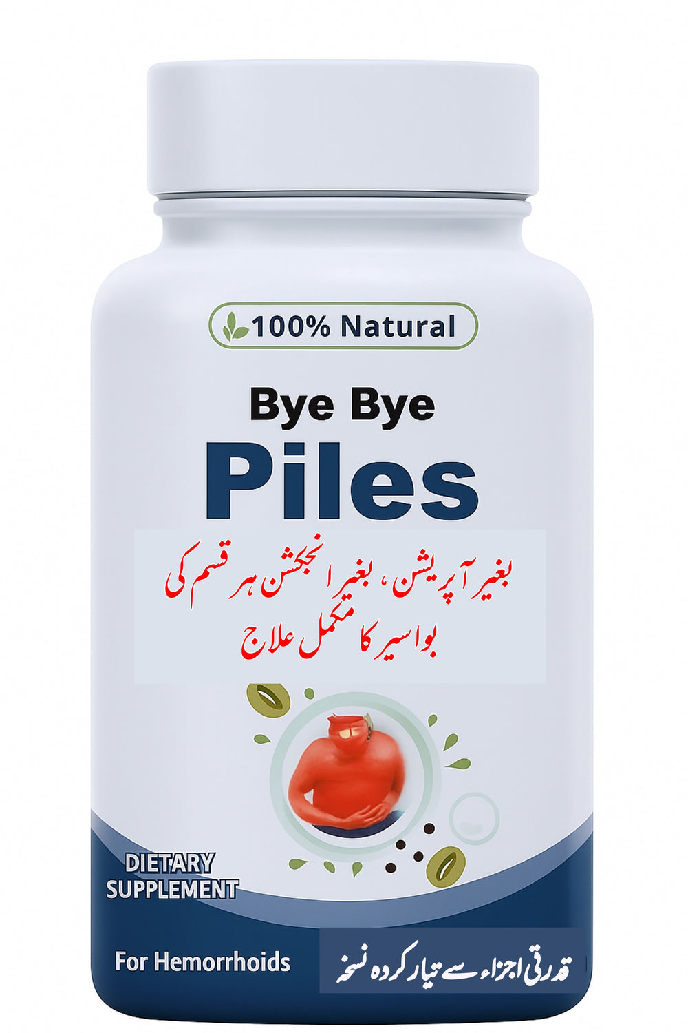 Bye Bye Piles is crafted from "natural ingredients" (قُدرتی اَجزا سے تیار کردہ نسخہ) and is a "dietary supplement" focused on "hemorrhoids."3 The Urdu text on the bottle emphasizes "complete treatment for all types of hemorrhoids, without surgery, without injections" (بغیر آپریشن، بغیر اِنجکشن ہر قِسم کی بواسیر کا مُکمَّل علاج).